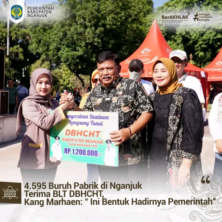 Nganjuk.Panjinasionalnews.com.Ribuan buruh pabrik rokok di Kabupaten Nganjuk tampak gembira dan bersyukur saat menerima Bantuan Langsung Tunai (BLT) yang bersumber dari Dana Bagi Hasil Cukai Hasil Tembakau (DBHCHT). Penyaluran bantuan dilaksanakan di Alun-Alun Nganjuk, pada Minggu, 5 Oktober 2025, dihadiri langsung oleh Bupati Nganjuk, Kang Marhaen dan Wakil Bupati Nganjuk, Mas Handy, juga Ketua TP PKK.