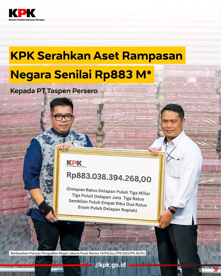 Jakarta.Panjinasionalnews.com.KPK menyerahkan barang rampasan negara kepada PT Taspen berupa uang tunai sejumlah Rp883 M & 6 unit efek. Pada prinsipnya, penyerahan barang rampasan ini merupakan pelaksanaan atas putusan inkracht Majelis Hakim yang menetapkan bahwa sitaan KPK dalam perkara tersebut ditetapkan menjadi milik negara c.q PT Taspen.