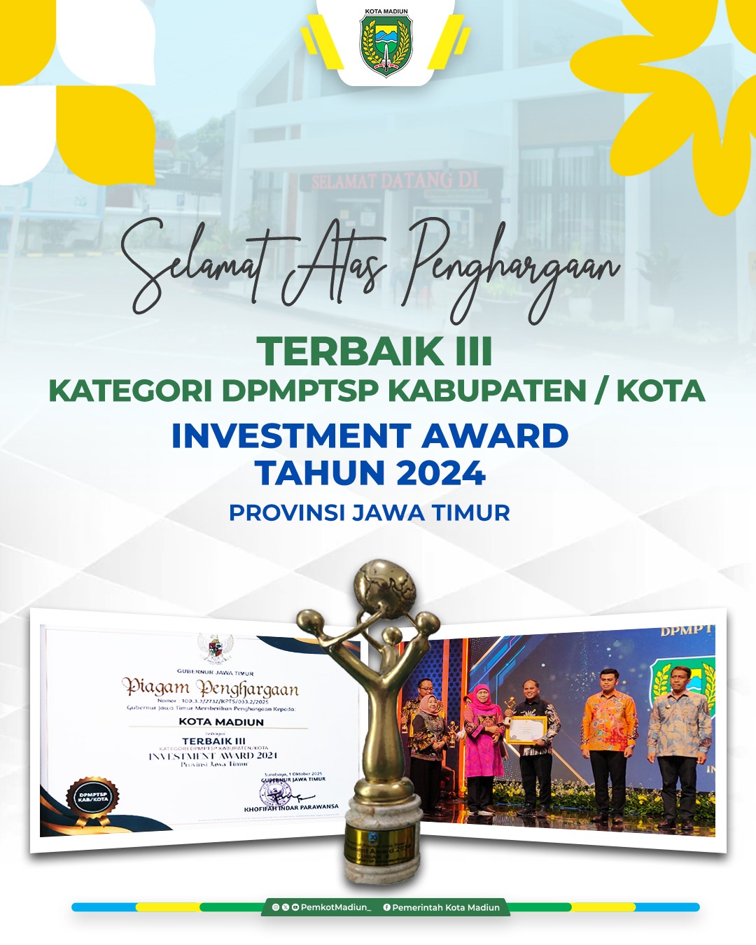 Penghargaan diserahkan langsung oleh Gubernur Jawa Timur, Khofifah Indar Parawansa, dan diterima oleh Kepala DPMPTSP Kota Madiun, Sumarno yang hadir mewakili Wali Kota Madiun, Dr. Maidi.(Dilansir dari Sumber Prokopim).