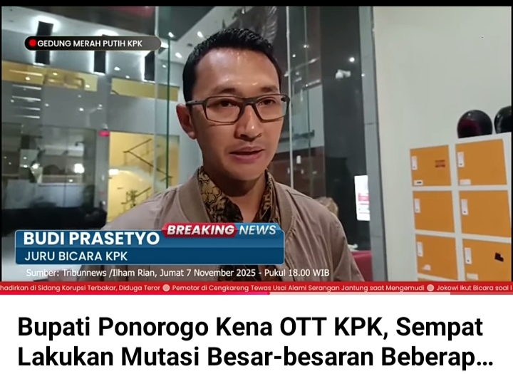Ponorogo.Panjinasionalnews.com.Kembali Komisi Pemberantasan Korupsi melakukan Operasi Tangkap Tangan terhadap Bupati Ponorogo Sugiri Sancoko yang telah menjabat Sebagai Bupati Ponorogo dua periode.Melalui juru bicara KPK,Budi Prasetyo mengeluarkan pernyataan resmi bahwa tim KPK saat sedang bergerak di wilayah Jawa Timur khususnya di wilayah Kabupaten Ponorogo untuk melakukan OTT terhadap pejabat yang dicurigai melakukan Tindak Pidana Korupsi.Budi Prasetyo menyebutkan bahwa Tim KPK saat sedang melakukan penyelidikan lebih lanjut untuk mengumpulkan bukti-bukti yang diduga digunakan untuk melakukan tindak Pidana Korupsi untuk dilakukan penyelidikan lebih lanjut terkait barang bukti yang bisa dijadikan sebagai alat bukti untuk menjerat Bupati Ponorogo dan mungkin orang-orang yang terlibat didalam lingkaran korupsi.