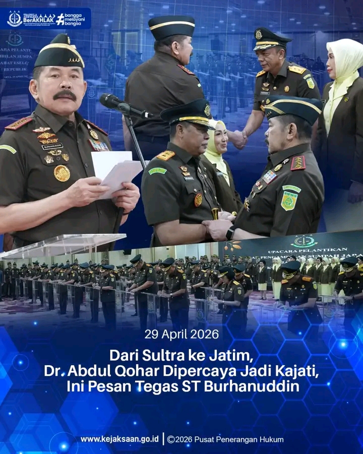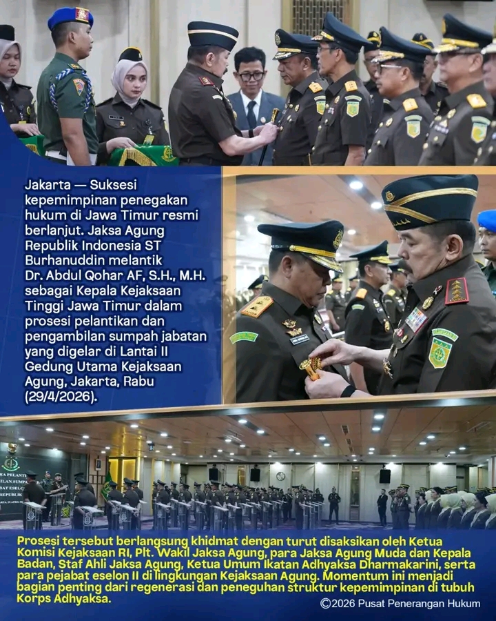 Jakarta.Panjinasionalnews.com.Suksesi kepemimpinan penegakan hukum di Jawa Timur resmi berlanjut. Jaksa Agung Republik Indonesia ST Burhanuddin melantik Dr. Abdul Qohar AF, S.H., M.H. sebagai Kepala Kejaksaan Tinggi Jawa Timur dalam prosesi pelantikan dan pengambilan sumpah jabatan yang digelar di Lantai II Gedung Utama Kejaksaan Agung, Jakarta, Rabu (29/4/2026).