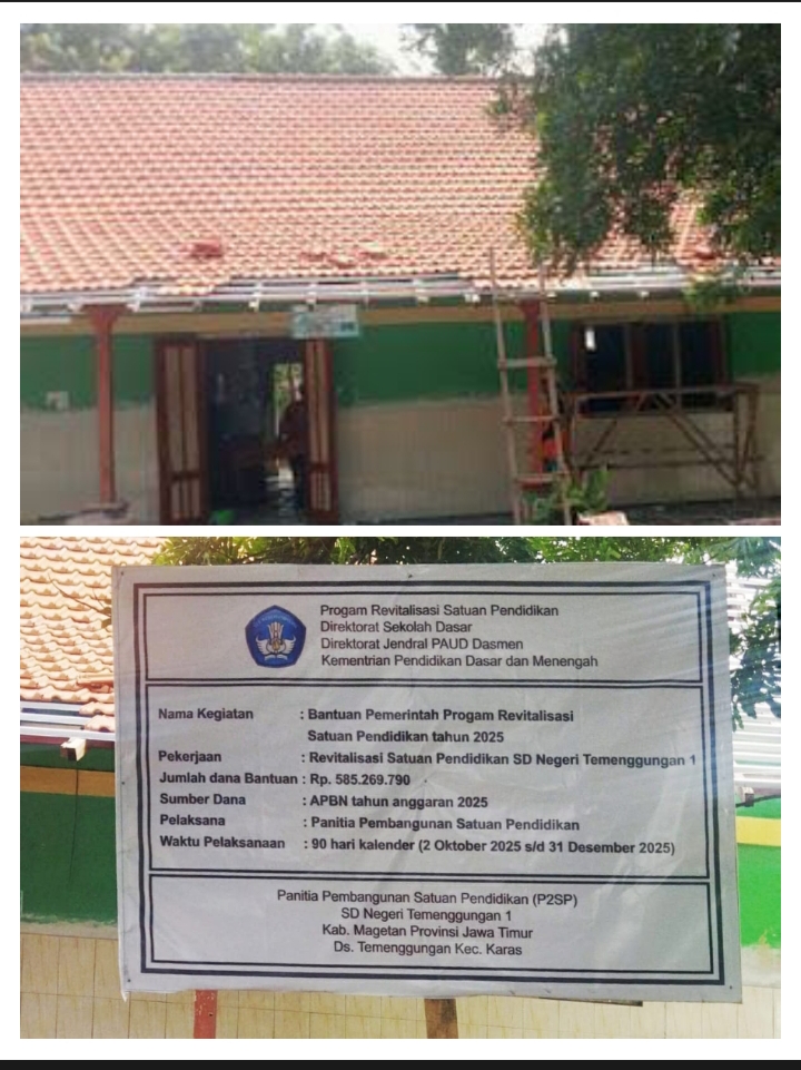Sebagaimana diketahui bahwa program revitalisasi untuk satuan pendidikan SDN Temenggungan 1, Kemendikbud mengalokasikan anggaran sebesar Rp 585.269.790.00 dari APBN yang dilaksanakan secara swakelola.
