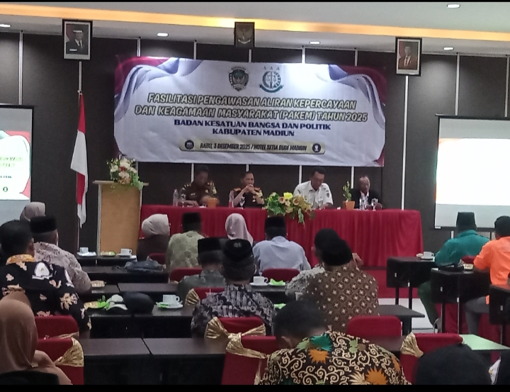 Madiun.Panjinasionalnews.com.Pemerintah daerah Kabupaten Madiun melalui Bakesbangpol Kab.Madiun menggelar Kegiatan Fasilitasi Pengawasan Aliran Kepercayaan dan Keagamaan Masyarakat di Hotel Setia Budi Kota Madiun.Dimana Kegiatan ini dihadiri oleh Kajari Ahmad Hariyanto Mayangkoro,SH, Kepala Seksi Intelijen, Achmad Wahyudi, S.H., M.H ,Ketua MLKI Kab.Madiun Kasno Dwi Santoso sebagai narasumber,dan Plt Sekban Krisbiyanto serta dari unsur organisasi dan kelompok aliran kepercayaan yang berada di Kabupaten Madiun.