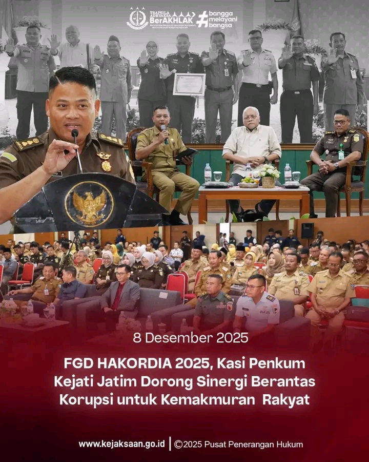 Jombang.Panjinasionalnews.com.Kejaksaan Tinggi Jawa Timur yang diwakili oleh Kepala Seksi Penerangan Hukum (Kasi Penkum) Windhu Sugiarto, S.H., M.H., CSSL hadir sebagai narasumber dalam kegiatan Focus Group Discussion dalam rangka Peringatan HAKORDIA 2025 Di Gedung Bung Tomo Kantor Pemerintah Kab. Jombang, Senin (8/12/2025).
