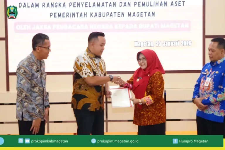 Bupati Magetan Nanik Sumantri, menyampaikan apresiasi atas keberhasilan proses sertifikasi aset milik daerah. Dari total sertifikat yang diterima, 10 bidang merupakan tanah sumber daya air dengan luas keseluruhan 17.223 meter persegi, sedangkan satu sertifikat lainnya berupa tanah dan bangunan gedung pendidikan seluas 241 meter persegi di Kelurahan Magetan.(Dilansir dari sumber prokopim).