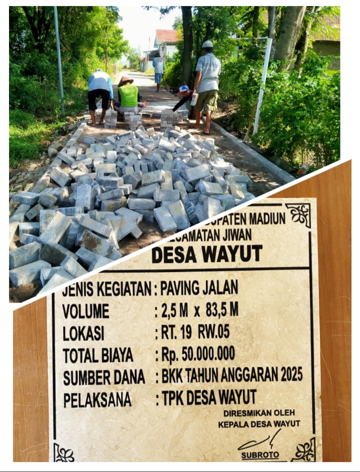 Madiun.Panjinasionalnews.com.Pemerintah Pusat berkomitmen bahwa hasil pembangunan harus merata dan dapat dinikmati hasilnya oleh rakyat.Untuk itu berbagai program pembangunan yang diluncurkan ke daerah harus mempunyai maksud dan tujuan untuk meningkatkan kemajuan daerah dan untuk meningkatkan kesejahteraan masyarakat.Adapun Program yang dikucurkan ke pemerintahan desa salah satunya adalah Bantuan Keuangan Khusus yang bersumber dari APBN maupun APBD, yang biasanya program ini diluncurkan dan disalurkan melalui anggota dewan.”Untuk program BKK tahun ini, pemerintahan Desa Wayut,Kec.Jiwan,Kab.Madiun merealisasikannya untuk pembangunan Pavingisasi Jalan Lingkungan.Dan program paving ini telah dilaksanakan di RT.19,RW.05 dengan anggaran sebesar Rp 50 juta.Adapun volume pengerjaan proyek Pavingisasi Jalan lingkungan ini adalah 2,5 M X 83,5 M dan semuanya dikerjakan oleh Timlak desa yang sudah ahli dibidangnya.Dan program pembangunan Pavingisasi Jalan lingkungan ini merupakan hasil Aspirasi Masyarakat Desa yang sudah direncanakan melalui Musdus maupun Musrenbangdes ,” jelas Kades Subroto.