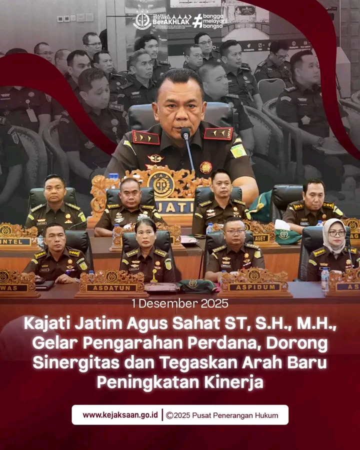 Pengarahan perdana ini menandai fondasi awal Kajati Jatim Agus Sahat ST untuk memperkuat tata kelola, memacu kualitas pelayanan, dan memastikan seluruh jajaran bergerak dalam satu komitmen menuju penegakan hukum yang profesional, humanis, dan berintegritas. (***).