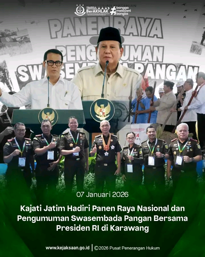 Karawang.Panjinasionalnews.com.Kepala Kejaksaan Tinggi Jawa Timur Agus Sahat ST, S.H., M.H., menghadiri acara Panen Raya Nasional dan Pengumuman Swasembada Pangan Nasional bersama Presiden Republik Indonesia Prabowo Subianto yang digelar di Desa Kertamukti, Kecamatan Cilebar, Kabupaten Karawang, Jawa Barat, Rabu (7/1/2026).