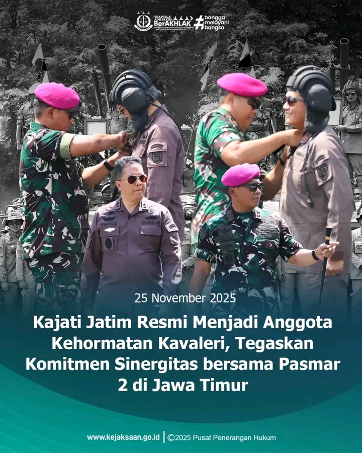 Surabaya.Panjinasionalnews.com.Kepala Kejaksaan Tinggi Jawa Timur, Dr. Kuntadi, S.H., M.H., menerima Brevet Kehormatan Kavaleri Korps Marinir yang disematkan langsung oleh Komandan Pasukan Marinir 2 (Danpasmar 2) Mayjen TNI (Mar) Dr. Oni Junianto di Ksatria Marinir Sutedi Senaputra Karang Pilang, Surabaya, Selasa (25/11/2025).