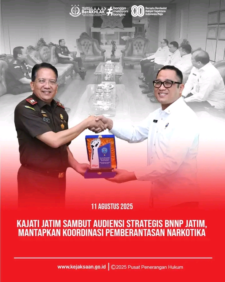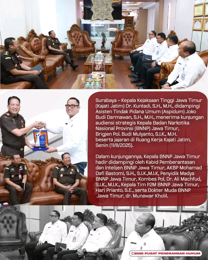 Surabaya.Panjinasionalnews.com.Kepala Kejaksaan Tinggi Jawa Timur (Kajati Jatim) Dr. Kuntadi, S.H., M.H., didampingi Asisten Tindak Pidana Umum (Aspidum) Joko Budi Darmawan, S.H., M.H., menerima kunjungan audiensi strategis Kepala Badan Narkotika Nasional Provinsi (BNNP) Jawa Timur, Brigjen Pol. Budi Mulyanto, S.I.K., M.H. beserta jajaran di Ruang Kerja Kajati Jatim, Senin (11/8/2025).