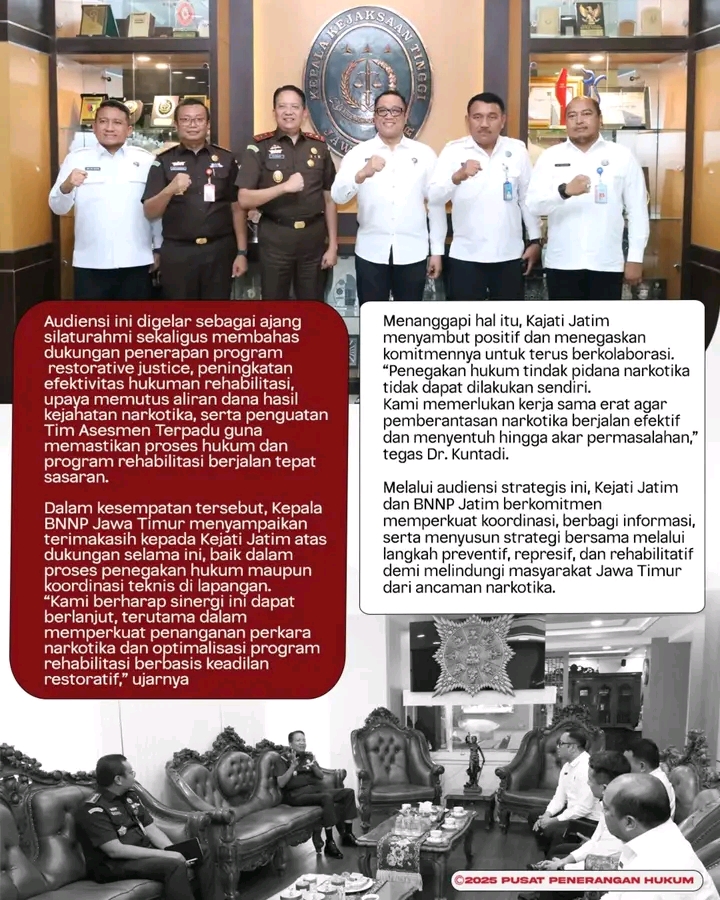 Melalui audiensi strategis ini, Kejati Jatim dan BNNP Jatim berkomitmen memperkuat koordinasi, berbagi informasi, serta menyusun strategi bersama melalui langkah preventif, represif, dan rehabilitatif demi melindungi masyarakat Jawa Timur dari ancaman narkotika.(***).