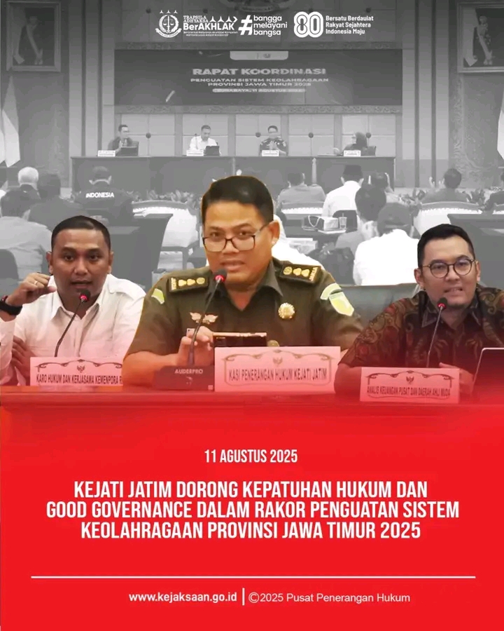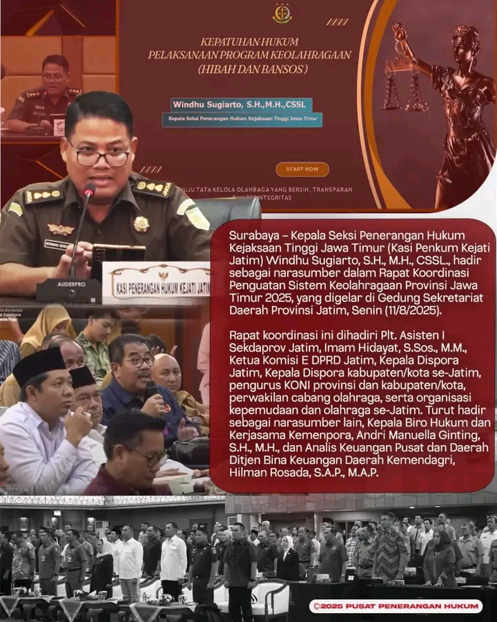 Surabaya.Panjinasionalnews.com.Kepala Seksi Penerangan Hukum Kejaksaan Tinggi Jawa Timur (Kasi Penkum Kejati Jatim) Windhu Sugiarto, S.H., M.H., CSSL., hadir sebagai narasumber dalam Rapat Koordinasi Penguatan Sistem Keolahragaan Provinsi Jawa Timur 2025, yang digelar di Gedung Sekretariat Daerah Provinsi Jatim, Senin (11/8/2025).