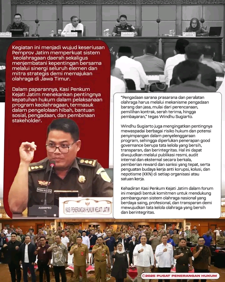 Dalam kesempatan tersebut, Kasi Penkum Kejati Jatim, Windhu Sugiarto, menegaskan pentingnya kepatuhan hukum dalam pelaksanaan program keolahragaan, terutama dalam pengelolaan hibah, bantuan sosial, pengadaan, dan pembinaan stakeholder, yang harus mengikuti mekanisme pengadaan barang dan jasa secara tepat.