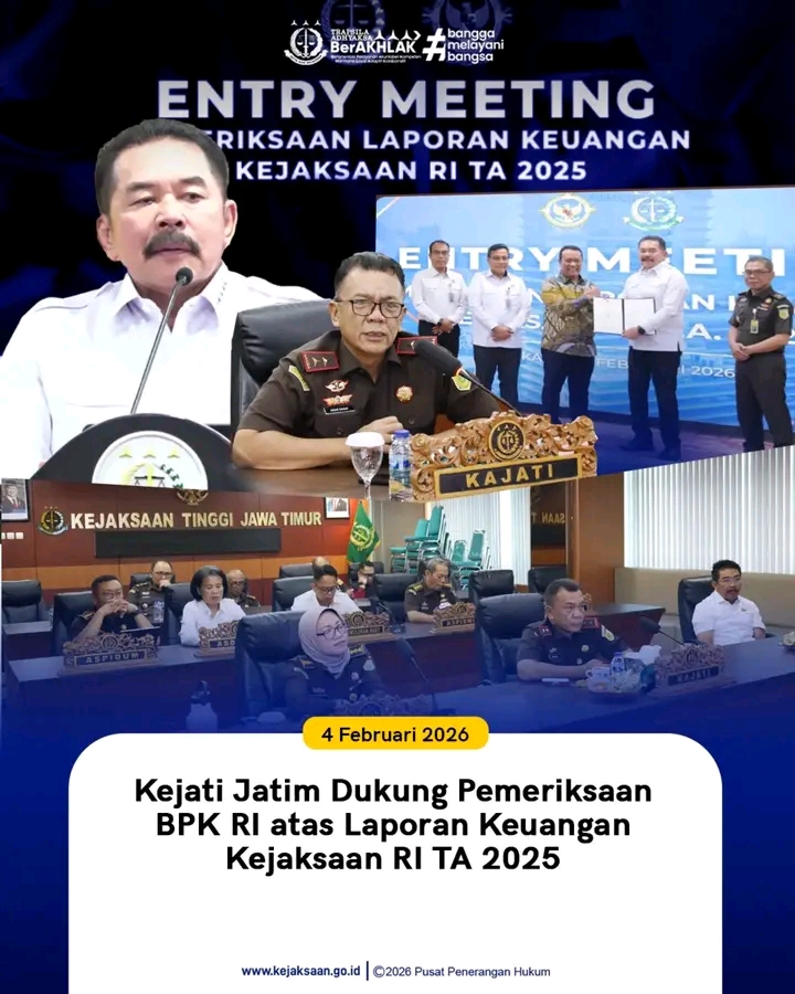 Kejaksaan Tinggi Jawa Timur menyatakan komitmen penuh untuk mendukung dan menyukseskan seluruh tahapan pemeriksaan sebagai bagian dari upaya memperkuat tata kelola, manajemen risiko, dan keberlanjutan kinerja agar tujuan penegakan hukum dapat dicapai secara efektif, kredibel, dan berintegritas.(***).