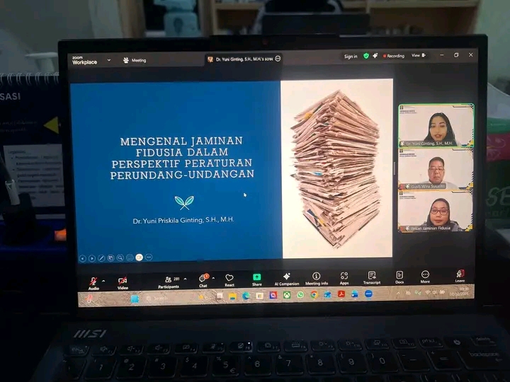 Sebagai narasumber pertama, Dr. Yuni Priskila Ginting dari Universitas Pelita Harapan, membawakan materi dasar tentang “Mengenal Jaminan Fidusia dalam Perspektif Peraturan Perundang-Undangan”.