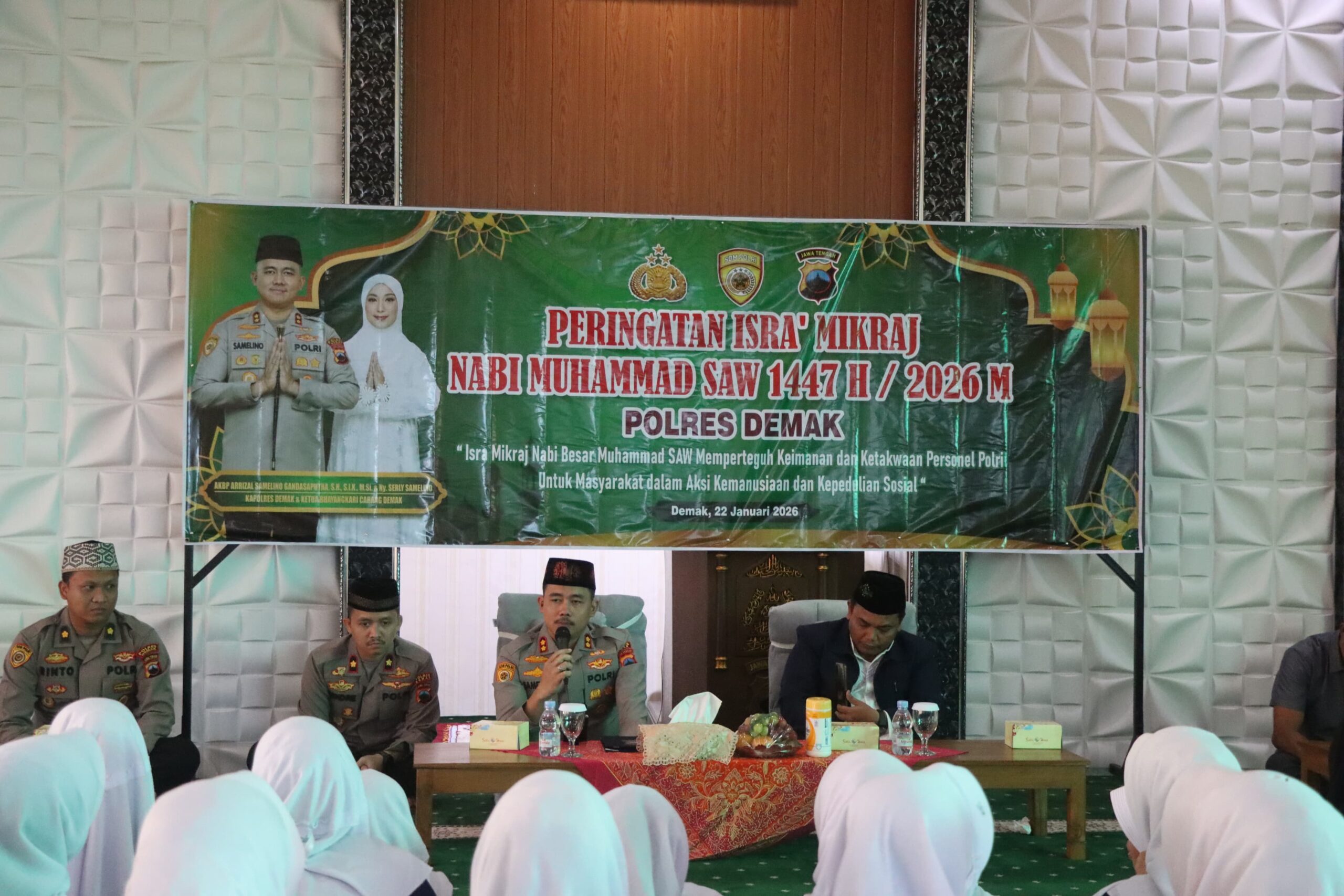 Kapolres Demak AKBP Samel mengatakan, peringatan Isra Mi’raj merupakan momentum penting untuk memperkuat nilai ketaatan, kedisiplinan, keikhlasan, serta tanggung jawab dalam menjalankan amanah, khususnya perintah salat yang menjadi pondasi pembentukan karakter pribadi yang jujur, disiplin, sabar, dan berintegritas.