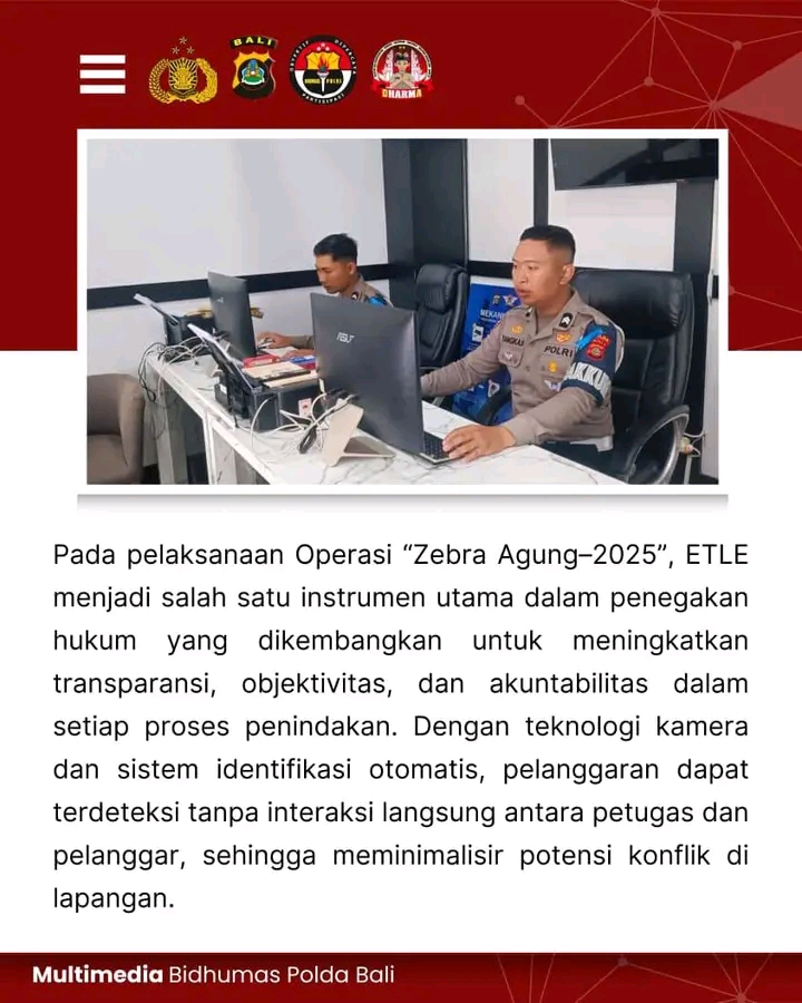 Polda Bali mengajak seluruh masyarakat untuk mendukung pemanfaatan ETLE sebagai langkah menuju budaya tertib berlalu lintas dan bagian dari transformasi digital dalam pelayanan publik kepolisian.Polda Bali Profesional, modern, dan terpercaya dalam menjaga keamanan berlalu lintas di Pulau Dewata.(***).