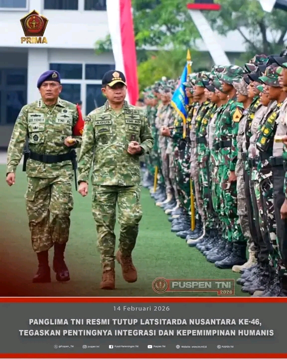 Jakarta.Panjinasionalnews.com.Panglima TNI Jenderal TNI Agus Subiyanto didampingi Kepala Staf TNI Angkatan Darat Jenderal TNI Maruli Simanjuntak dan Kepala Staf TNI Angkatan Udara Marsekal TNI Mohamad Tonny Harjono, secara resmi menutup Latihan Integrasi Taruna Wreda (Latsitarda) Nusantara ke-46 Provinsi Aceh. Upacara penutupan berlangsung di Dermaga Mako Kolinlamil, Tanjung Priok, Sabtu (14/2/2026).