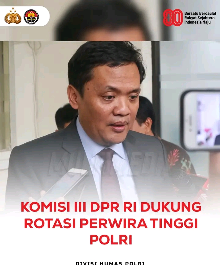 Jakarta.Panjinasionalnews.com.Ketua Komisi III DPR RI, Dr. Habiburokhman, S.H., M.H., menyatakan dukungannya atas langkah Kapolri, Jenderal Polisi Drs. Listyo Sigit Prabowo, M.Si., dalam melakukan rotasi dan promosi terhadap sejumlah perwira tinggi Polri. Menurutnya, rotasi ini menjadi bentuk penyegaran sekaligus strategi penguatan organisasi. Ia menilai langkah ini mencerminkan prinsip the right man on the right place, di mana setiap perwira ditempatkan sesuai kompetensi dan kebutuhan organisasi.(Hms Polri)