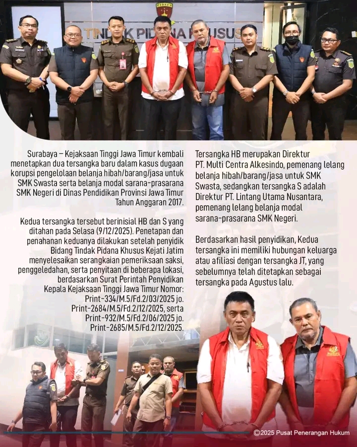 Surabaya.Panjinasionalnews.com.Kejaksaan Tinggi Jawa Timur kembali menetapkan dua tersangka baru dalam kasus dugaan korupsi pengelolaan belanja hibah/barang/jasa untuk SMK Swasta serta belanja modal sarana-prasarana SMK Negeri di Dinas Pendidikan Provinsi Jawa Timur Tahun Anggaran 2017.