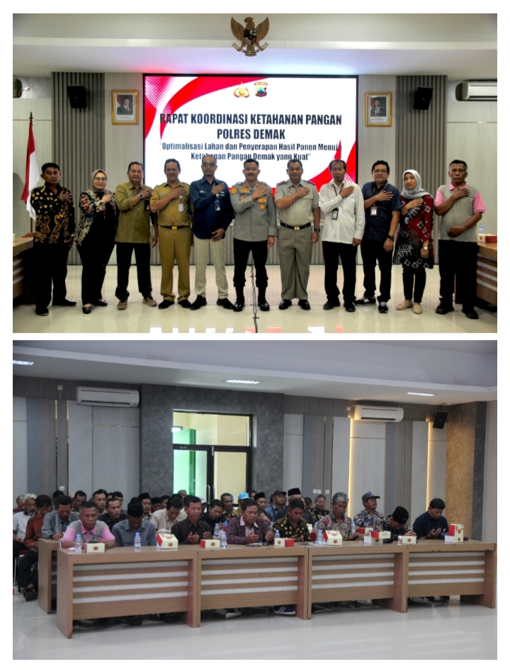 Demak.Panjinasionalnews.com.Kepolisian Resor Demak, Jawa Tengah, menggelar rapat koordinasi ketahanan pangan di Aula Wicaksana Laghawa, Selasa (14/4/2026). Forum lintas sektor ini menyoroti sejumlah persoalan krusial, mulai dari belum optimalnya pemanfaatan lahan hingga rendahnya serapan hasil panen oleh Bulog.