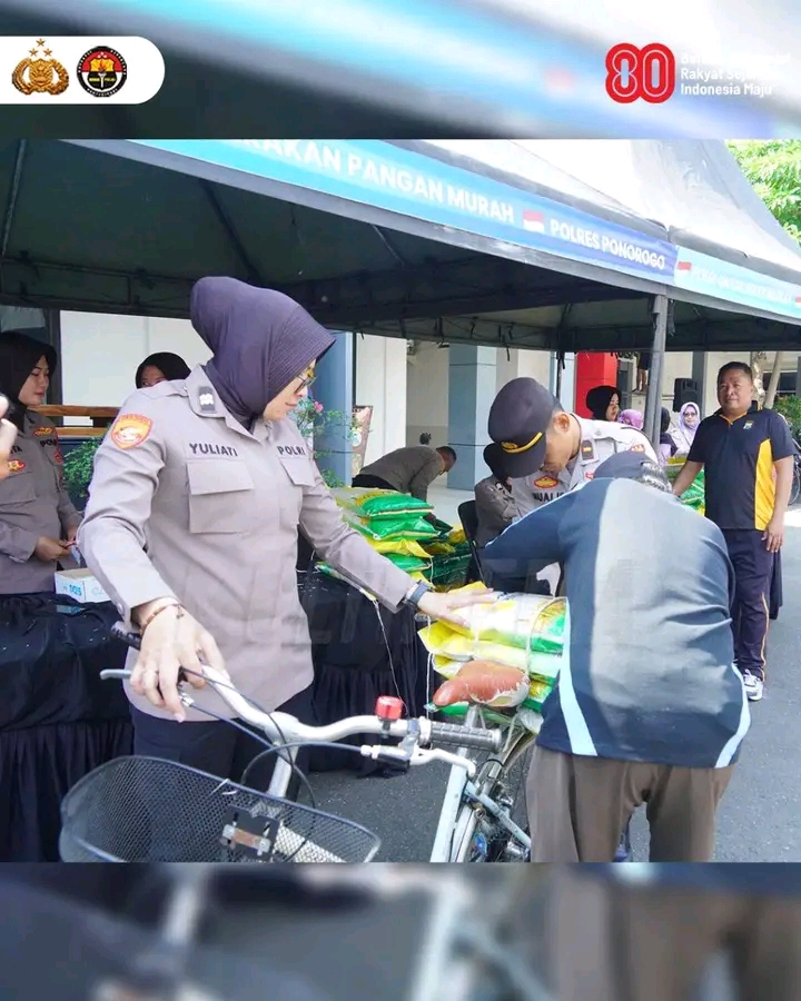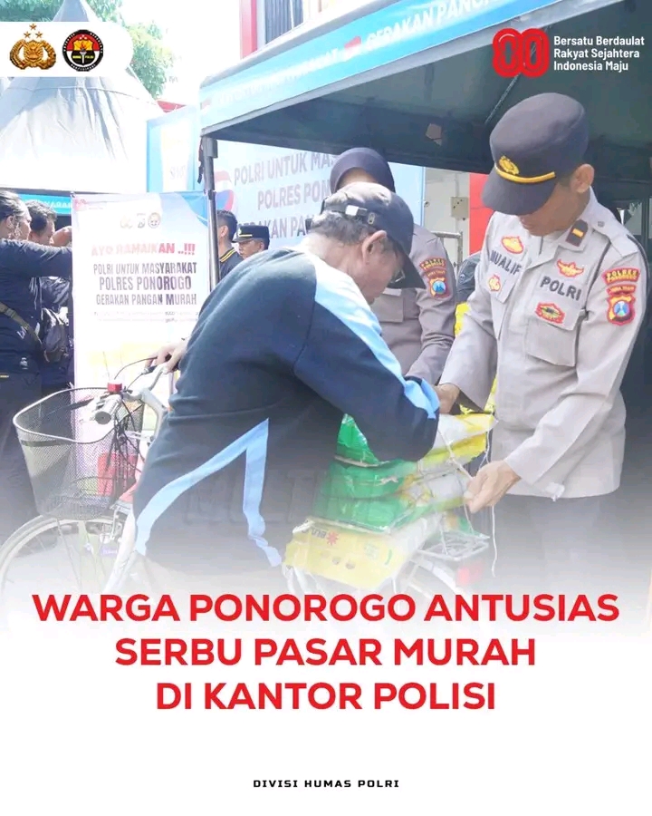 Ponorogo.Panjinasionalnews.com.Ratusan warga memburu sembako murah dalam program Gerakan Pangan Murah (GPM) yang digelar di halaman Mapolres Ponorogo, Jawa Timur (Jatim), pada Jumat (8/8). Di pasar murah ini disediakan sebanyak 47 ton beras SPHP kemasan 5 kg, dengan rincian 42 ton disebar ke 21 Polsek, sedangkan sisanya berada di Polres Ponorogo. Beras tersebut dijual seharga Rp11.500 per kilogram, lebih murah dari harga eceran tertinggi yakni Rp12.700. Selain beras, juga tersedia minyak goreng dengan harga lebih terjangkau dibandingkan harga di pasaran.(Dilansir dari Hms Polri).
