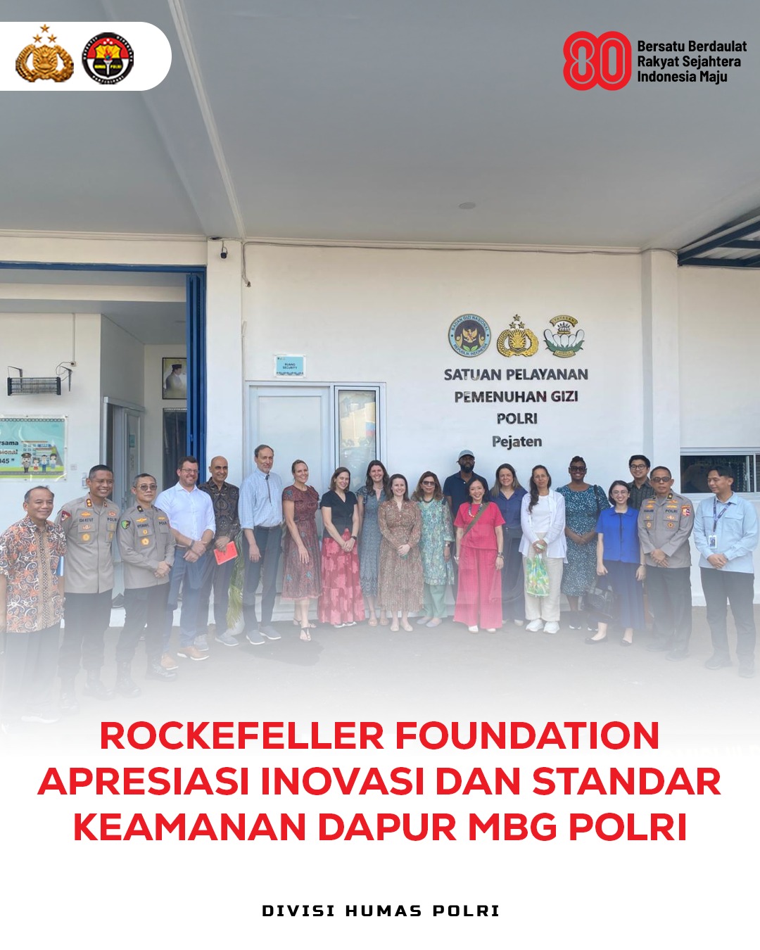 Jakarta.Panjinasionalnews.com.Polri kembali menunjukkan komitmen mendukung visi Asta Cita Presiden RI melalui program Makan Bergizi Gratis (MBG) dengan membangun Sentra Pelayanan Pemenuhan Gizi (SPPG) Polri. Inovasi ini mendapat apresiasi dari Rockefeller Foundation saat meninjau langsung SPPG Polri di Pejaten, Jakarta Selatan. Kunjungan dipimpin Executive Vice President Rockefeller Foundation bidang Program Strategy, Elizabeth Yee, yang menilai Polri berhasil menerapkan sistem produksi efisien dengan standar keamanan pangan tinggi.