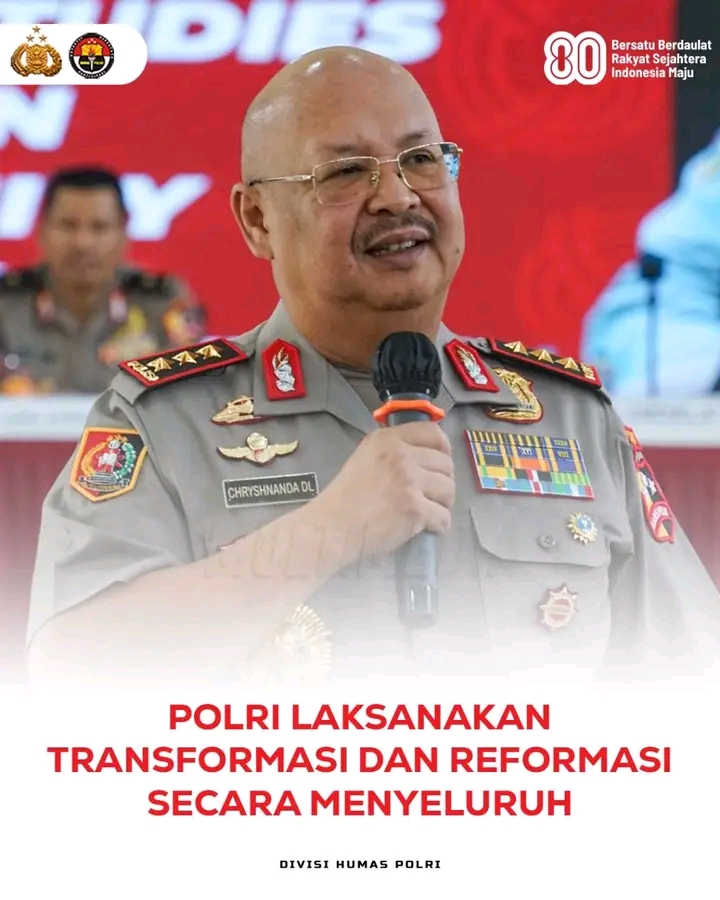 Jakarta.Panjinasionalnews.com.Polri mencanangkan agenda transformasi dan reformasi secara menyeluruh sebagai langkah menjawab tuntutan zaman. Ketua Tim Transformasi Reformasi Polri, Kalemdiklat Polri Komjen Pol. Prof. Dr. Chryshnanda Dwilaksana, M.Si., menegaskan perubahan ini tidak hanya pada aspek fisik maupun struktur birokrasi, tetapi juga menyentuh nilai moral dan kemanusiaan. Program ini dilaksanakan untuk meningkatkan pelayanan publik, menegakkan hukum yang beradab, serta menjaga stabilitas masyarakat. Polri berkomitmen menghadirkan kebaikan, perbaikan, dan kualitas pemolisian yang semakin presisi. Dengan transformasi ini, Polri diharapkan semakin profesional, humanis, dan mampu menjawab tantangan masa depan.(Dilansir dari Sumber Hms Polri).