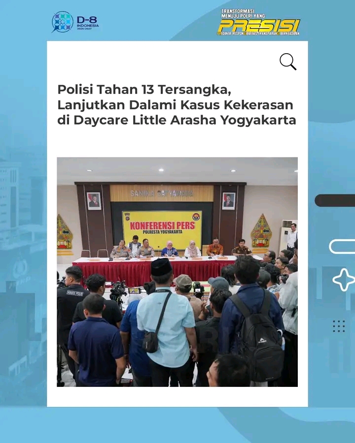 Jakarta.Panjinasionalnews.com.Polri melalui Unit PPA Satreskrim Polresta Yogyakarta merespon cepat terkait kasus kekerasan dan penelantaran anak di sebuah daycare Little Aresha. Dalam penanganan kasus ini, Kepolisian telah mengamankan 13 orang tersngka yang terdiri dari ketua yayasan, kepala sekolah, hingga pengasuh.