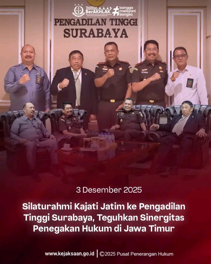 Kehadiran Kajati dan Wakajati Jatim disambut hangat oleh Ketua Pengadilan Tinggi Surabaya, Sujatmiko, S.H., M.H., beserta jajaran. Agenda kunjungan ini menjadi langkah awal memperkenalkan diri sekaligus memperkuat Soliditas antar aparat penegak hukum di Jawa Timur yang selama ini terjalin erat.(Dilansir dari Sumber Kejati).