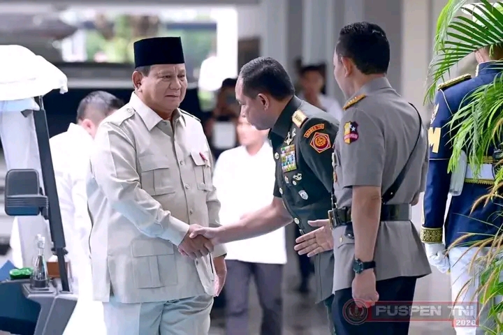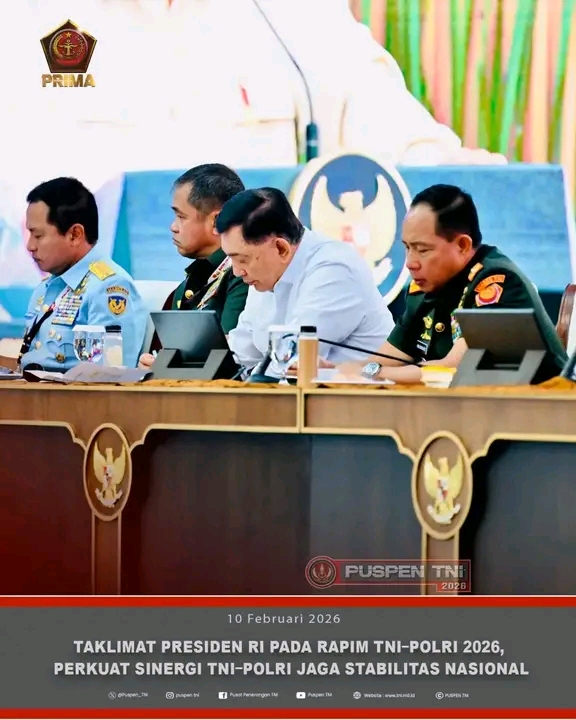 Jakarta.Panjinasionalnews.com.Panglima TNI Jenderal TNI Agus Subiyanto bersama Menteri Pertahanan RI Sjafrie Sjamsoeddin serta Kepala Staf TNI Angkatan Darat Jenderal TNI Maruli Simanjuntak, Kepala Staf TNI Angkatan Laut Laksamana TNI Muhammad Ali, dan Kepala Staf TNI Angkatan Udara Marsekal TNI Mohamad Tonny Harjono menghadiri Rapat Pimpinan (Rapim) TNI–Polri yang dipimpin langsung oleh Presiden Republik Indonesia Prabowo Subianto di Istana Negara, Jakarta Pusat, Senin (9/2/2026).