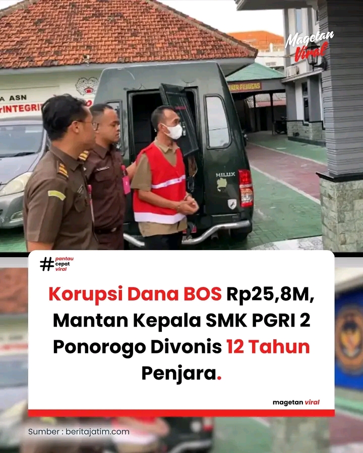 Ponorogo.Panjinasionalnews.com.Kepala SMK 2 PGRI Ponorogo,Syamhudi Arifin, harus menghadapi dan menerima konsekuensi hukum yang berat akibat perbuatannya.Dimana Majelis hakim Pengadilan Tindak Pidana Korupsi (Tipikor) Surabaya telah menjatuhkan vonis pidana penjara selama 12 tahun atas kasus tindak pidana korupsi penyalahgunaan dana Bantuan Operasional Sekolah (BOS) dalam kurun waktu 2019 sampai 2024.