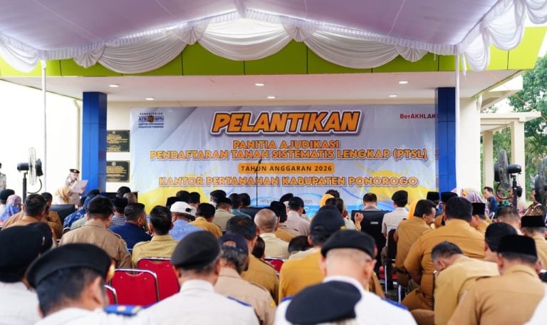 Ponorogo.Panjinasionalnews.com.Pogram Pendaftaran Tanah Sistematis Lengkap (PTSL) kembali bergulir di wilayah Ponorogo dengan mengedepankan kualitas. Untuk itu Kepala Kantor Agraria dan Tata Ruang/Badan Pertanahan (ATR/BPN) Ponorogo Ferri Saragih melantik panitia ajudikasi PTSL 2026 .(Dilansir dari sumber prokopim).