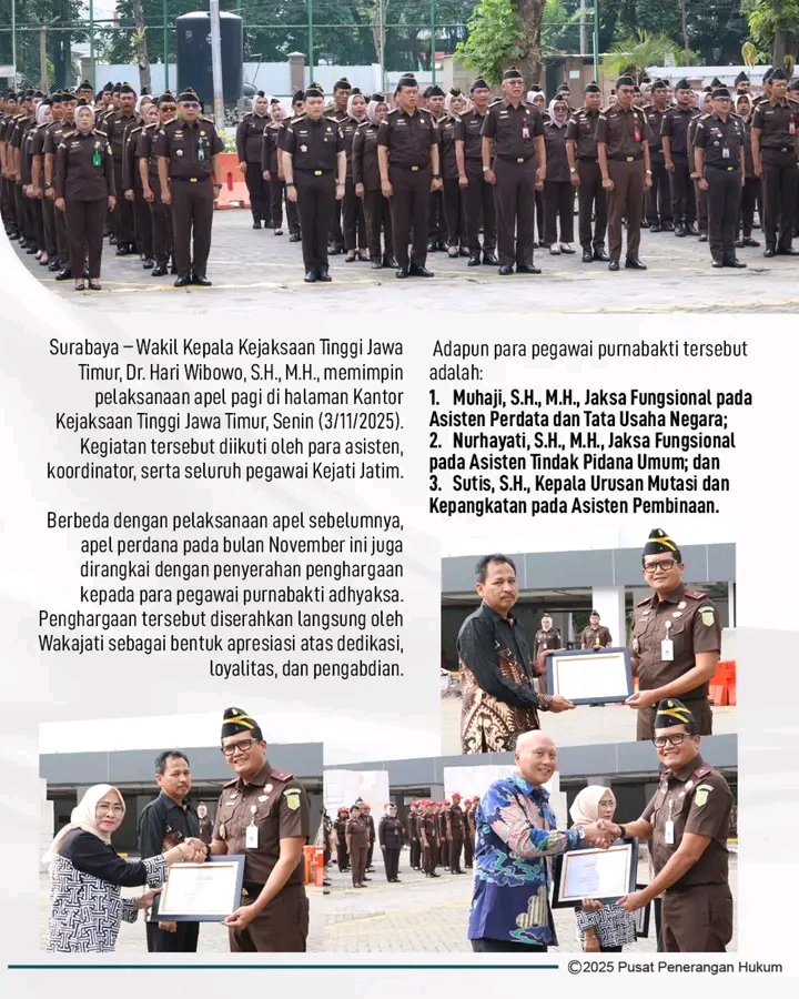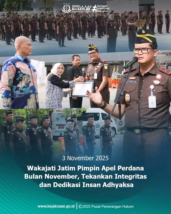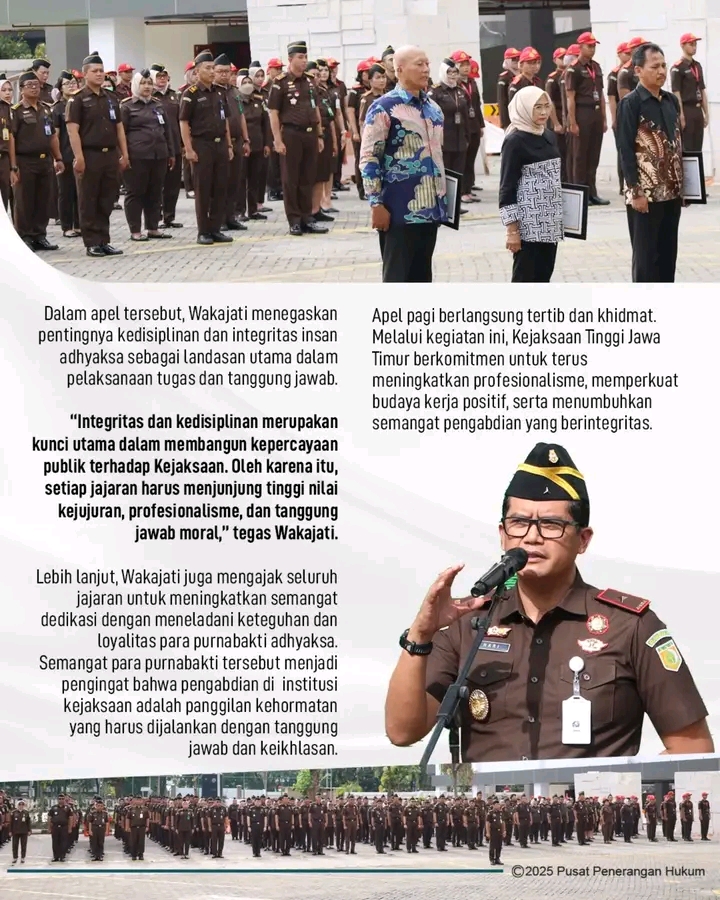 Apel pagi berlangsung tertib dan khidmat. Melalui kegiatan ini, Kejaksaan Tinggi Jawa Timur berkomitmen untuk terus meningkatkan profesionalisme, memperkuat budaya kerja positif, serta menumbuhkan semangat pengabdian yang berintegritas.(***)