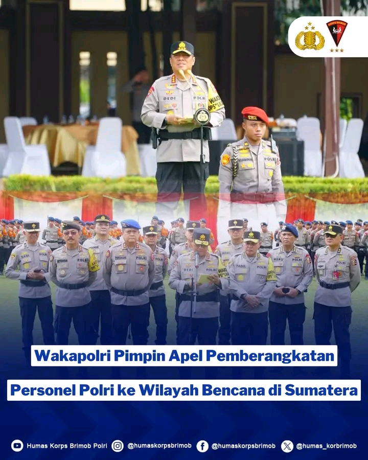 Jakarta.Panjinasionalnews.com.Wakil Kepala Kepolisian Negara Republik Indonesia (Wakapolri) Komjen Pol. Dedi Prasetyo memimpin Apel Pemberangkatan Personel Polri dalam rangka penanggulangan bencana alam di wilayah Aceh, Sumatera Utara, dan Sumatera Barat. Apel digelar di Lapangan Bhayangkara Mabes Polri, Jumat (26/12/2025).