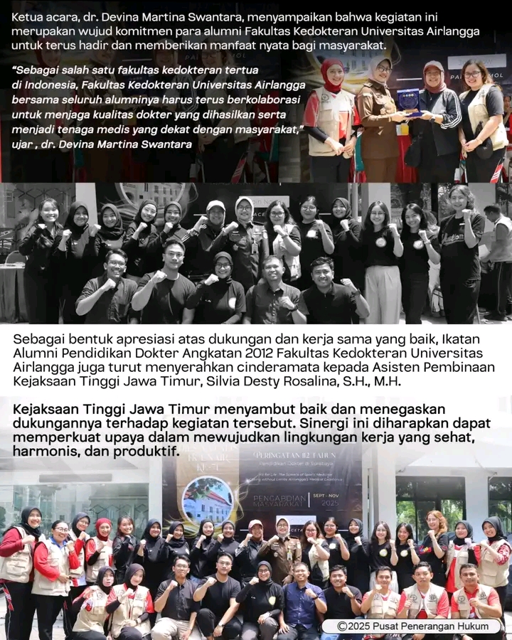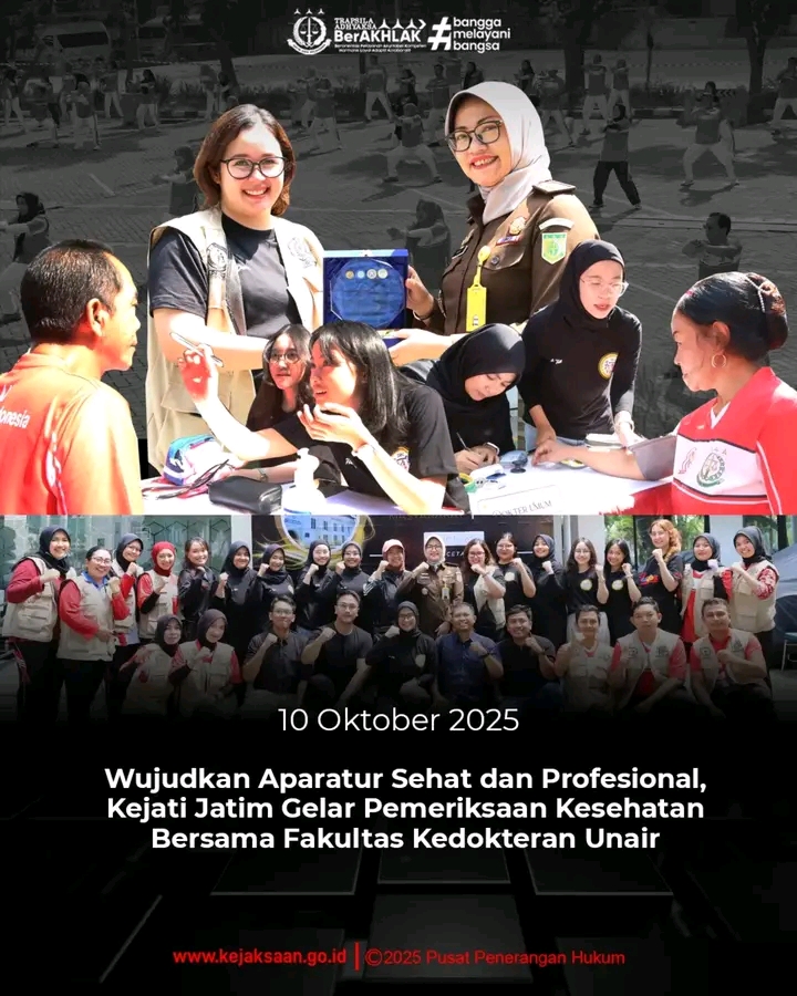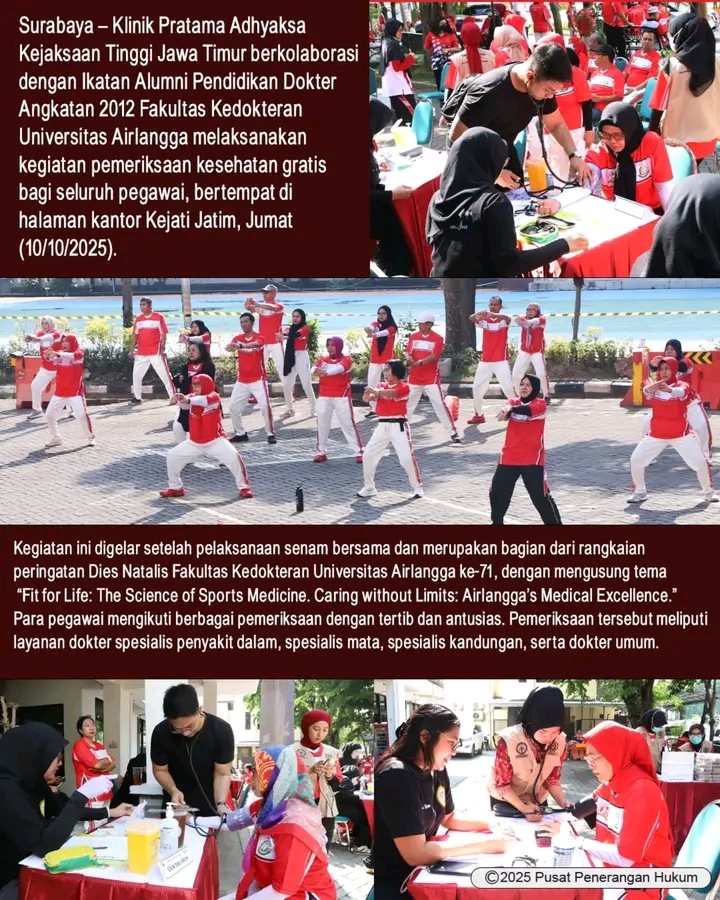 Surabaya.Panjinasionalnews.com.Klinik Pratama Adhyaksa Kejaksaan Tinggi Jawa Timur berkolaborasi dengan Ikatan Alumni Pendidikan Dokter Angkatan 2012 Fakultas Kedokteran Universitas Airlangga melaksanakan kegiatan pemeriksaan kesehatan gratis bagi seluruh pegawai, bertempat di halaman kantor Kejati Jatim, Jumat (10/10/2025).